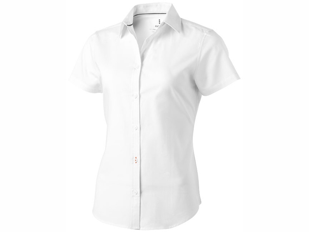 Женская рубашка с короткими рукавами Manitoba. Стандартный покрой. Белые пуговицы с гравировкой Elevate. Вторая петелька для пуговицы внизу с оранжевой строчкой. Принт лого сзади в тон изделия. Сатиновая вставка внутри горловины. Оксфорд, 100% хлопок. 40x32/2, 110x50. Трафаретная печать (1 цвет (цветные изделия)) на данный товар осуществляется бесплатно. Оплачивается только настройка оборудования в размере 8200 рублей на весь тираж.
