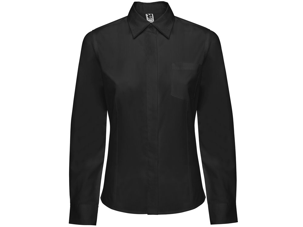 Рубашка женская прилегающего силуэта с длинным рукавом, вытачки на полочке и спинке. Накладной карман на груди слева, закругленный низ изделия. Планка с потайными пуговицами.