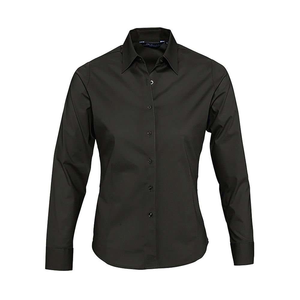 Рубашка приталенного кроя с воротником на одной пуговице. Планка на 7 пуговиц в тон, манжеты на 2 пуговицах, вытачки спереди и на спинке.
