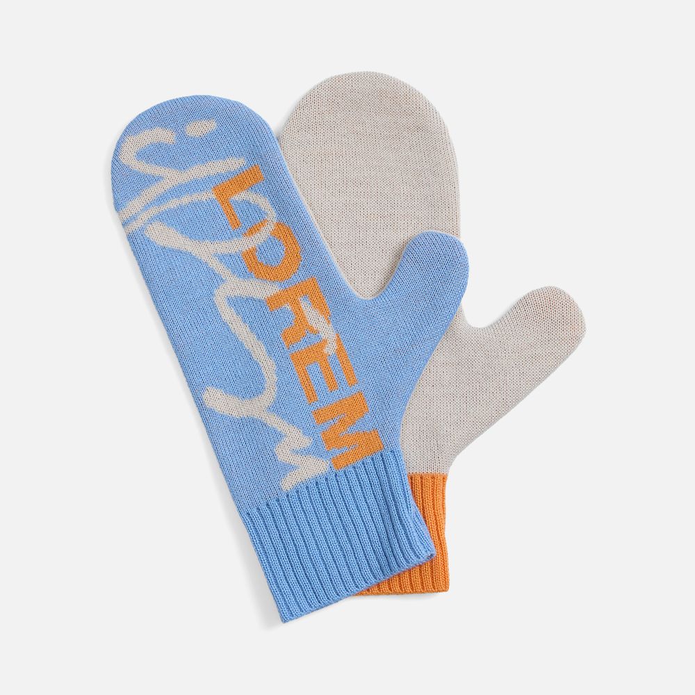 Варежки с вывязанным логотипом и индивидуальным рисунком в фирменной цветовой гамме.