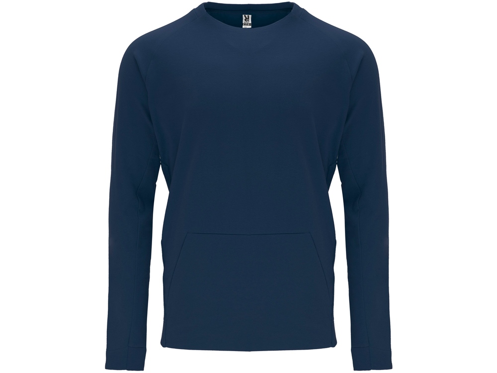 Свитшот с рукавом реглан. Горловина спинки и боковая часть манжет из риба 1х1. Карман кенгуру, диагональные боковые швы с наклонам к центру переда.