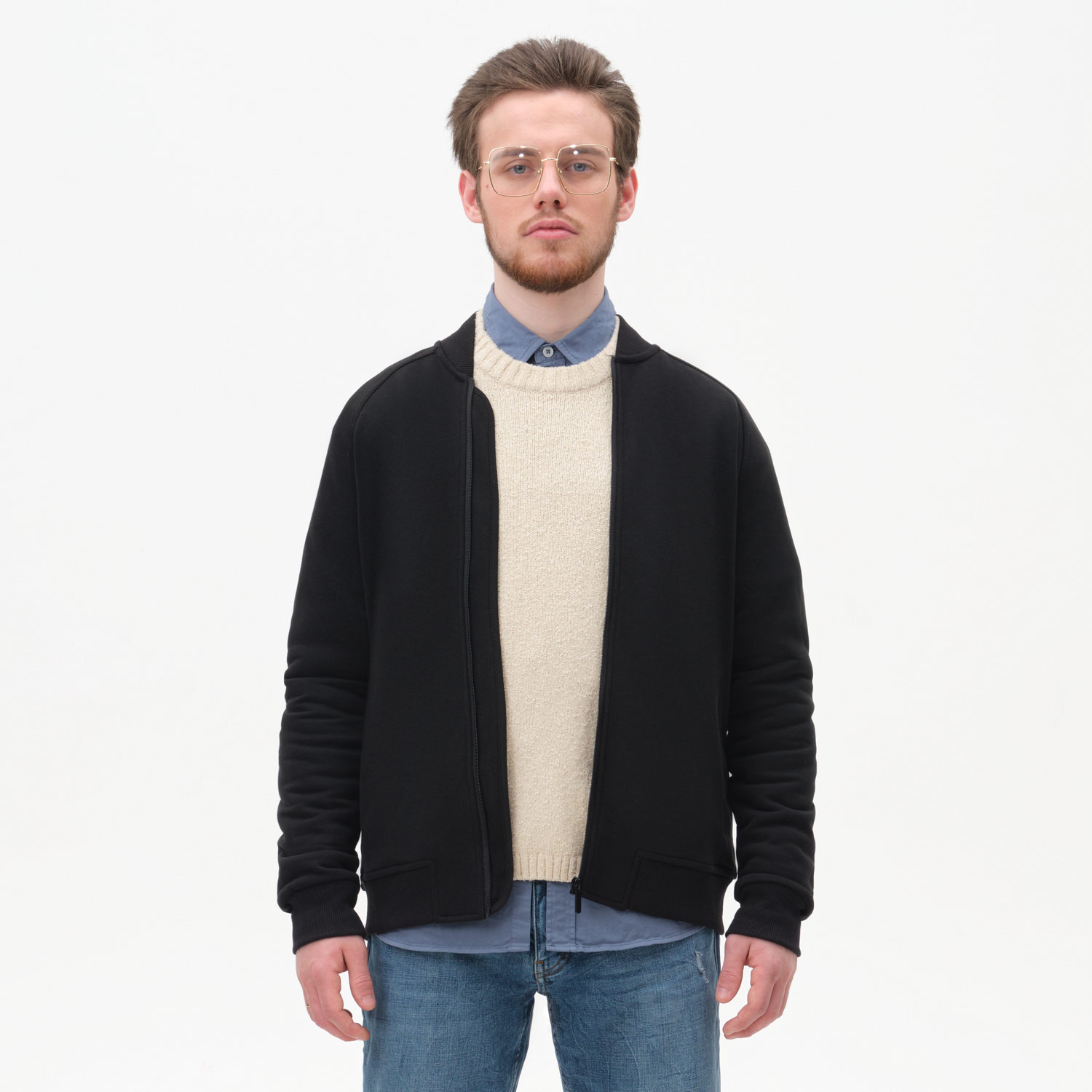 Стильная толстовка бомбер унисекс на реверсной молнии свободного силуэта с прорезными карманами в рамку.