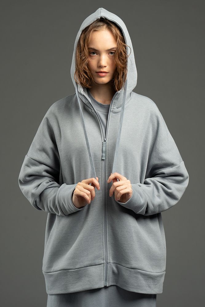 Толстовка унисекс на молнии со спущенным плечом.