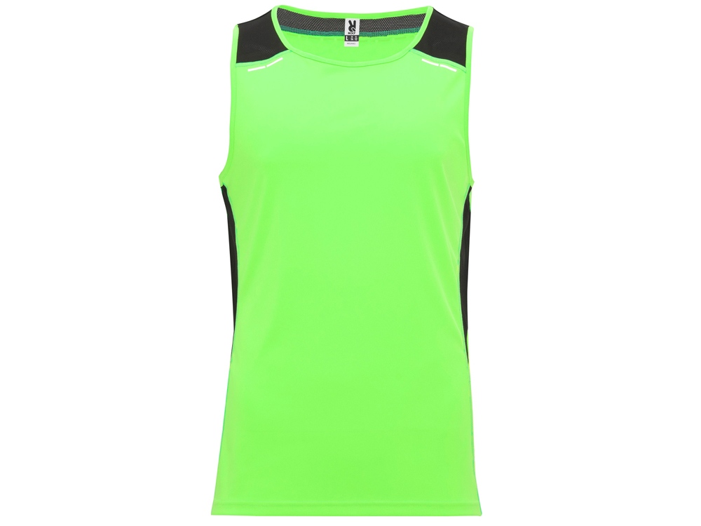 Спортивная майка со светоотражающими деталями. Круглый вырез горловины укреплен декоративной строчкой. Комбинация двух полиэстеровых полотен: основное полотно интерлок, боковые и верхние вставки из микроперфорированного полотна для повышенной воздухопроницаемости. Технологичное полотно быстро сохнет.