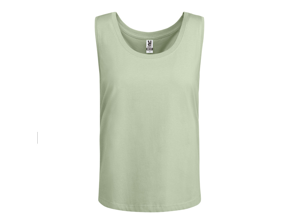 Свободная женская футболка с широкими бретелями. Вырез и проймы обработаны бейкой из риба 1x1. Подол округлой формы. Боковые швы.