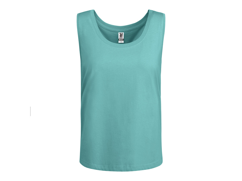 Свободная женская футболка с широкими бретелями. Вырез и проймы обработаны бейкой из риба 1x1. Подол округлой формы. Боковые швы.