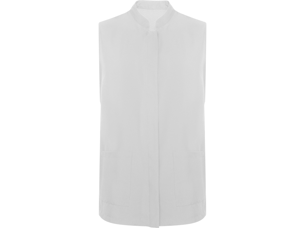 Жилетка без рукавов. Застежка спереди со скрытыми кнопками-застежками. Воротник-стойка, боковые вставки и складки в области груди. Два передних накладных кармана.