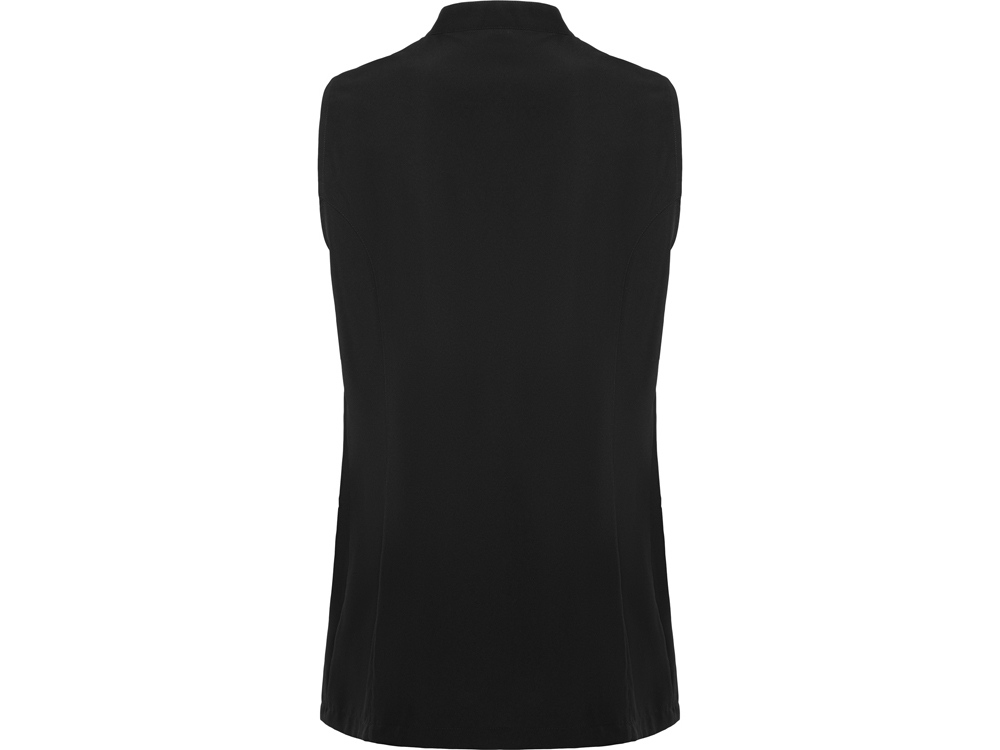 Жилетка без рукавов. Застежка спереди со скрытыми кнопками-застежками. Воротник-стойка, боковые вставки и складки в области груди. Два передних накладных кармана.