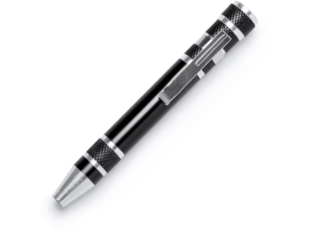 Алюминиевый мультитул в форме ручки. В комплекте 8 головок бит