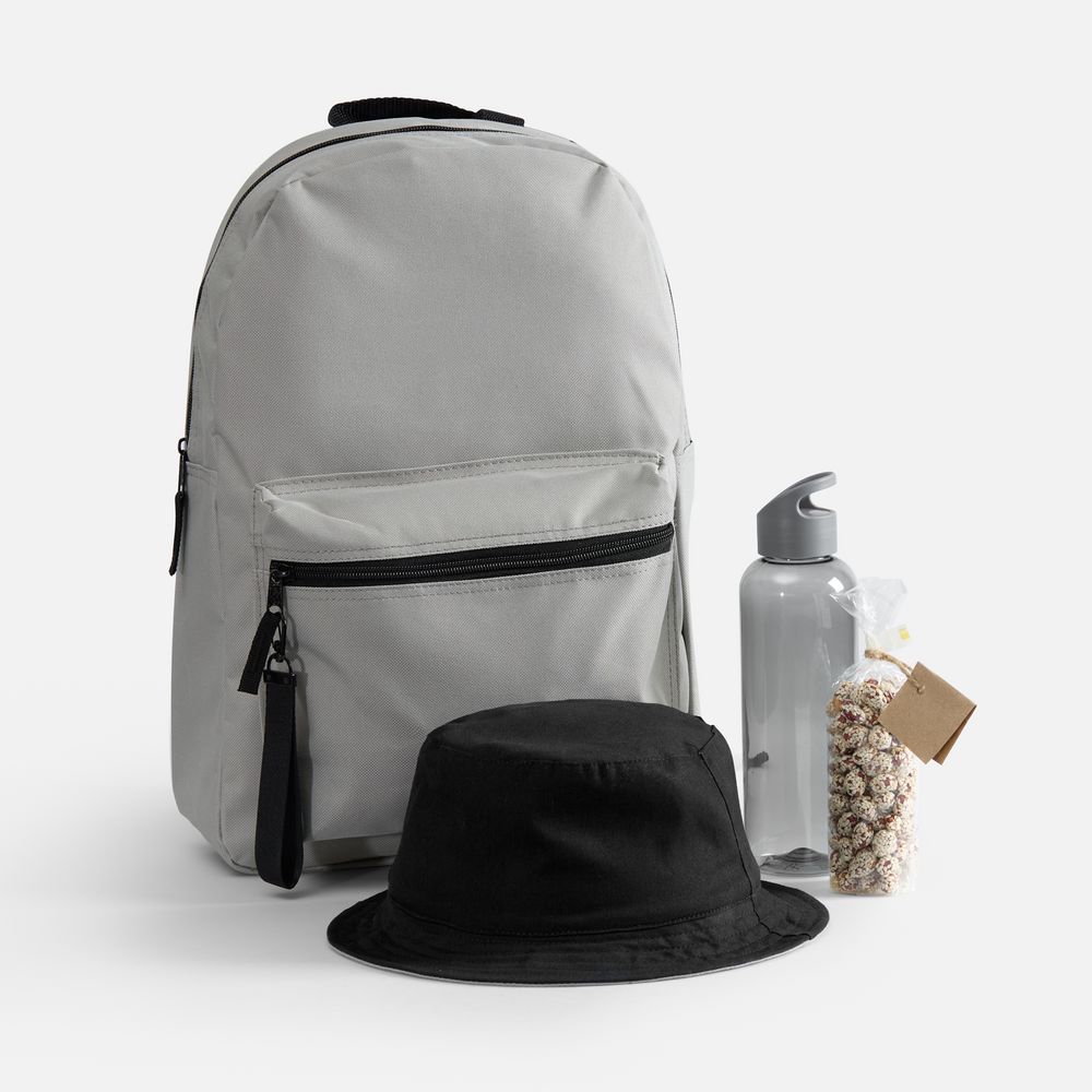 В нем есть все необходимое для комфортной летней прогулки: всегда актуальная в солнечный день панама, стиль которой можно менять буквально на ходу; бутылка для воды оптимального объема, а также сладкий снек для полезного и питательного перекуса. А захватить все с собой, конечно, будет удобно в лаконичном базовом городском рюкзаке, дополнительно оформленном ремувкой — стильным съемным текстильным брелком.