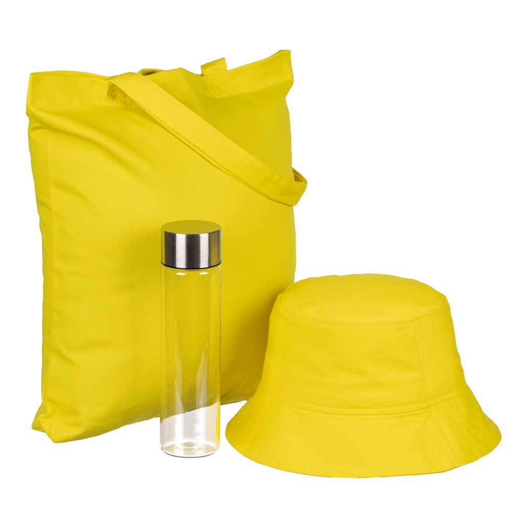 бутылка - пластик, металл, панама - хлопок 100%, пластик, сумка - хлопок 100%, хлопок 100%