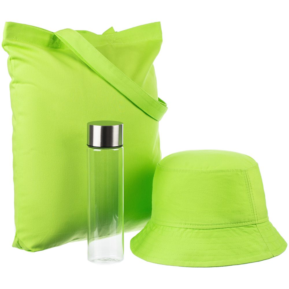 бутылка - пластик, металл, панама - хлопок 100%, пластик, сумка - хлопок 100%, хлопок 100%