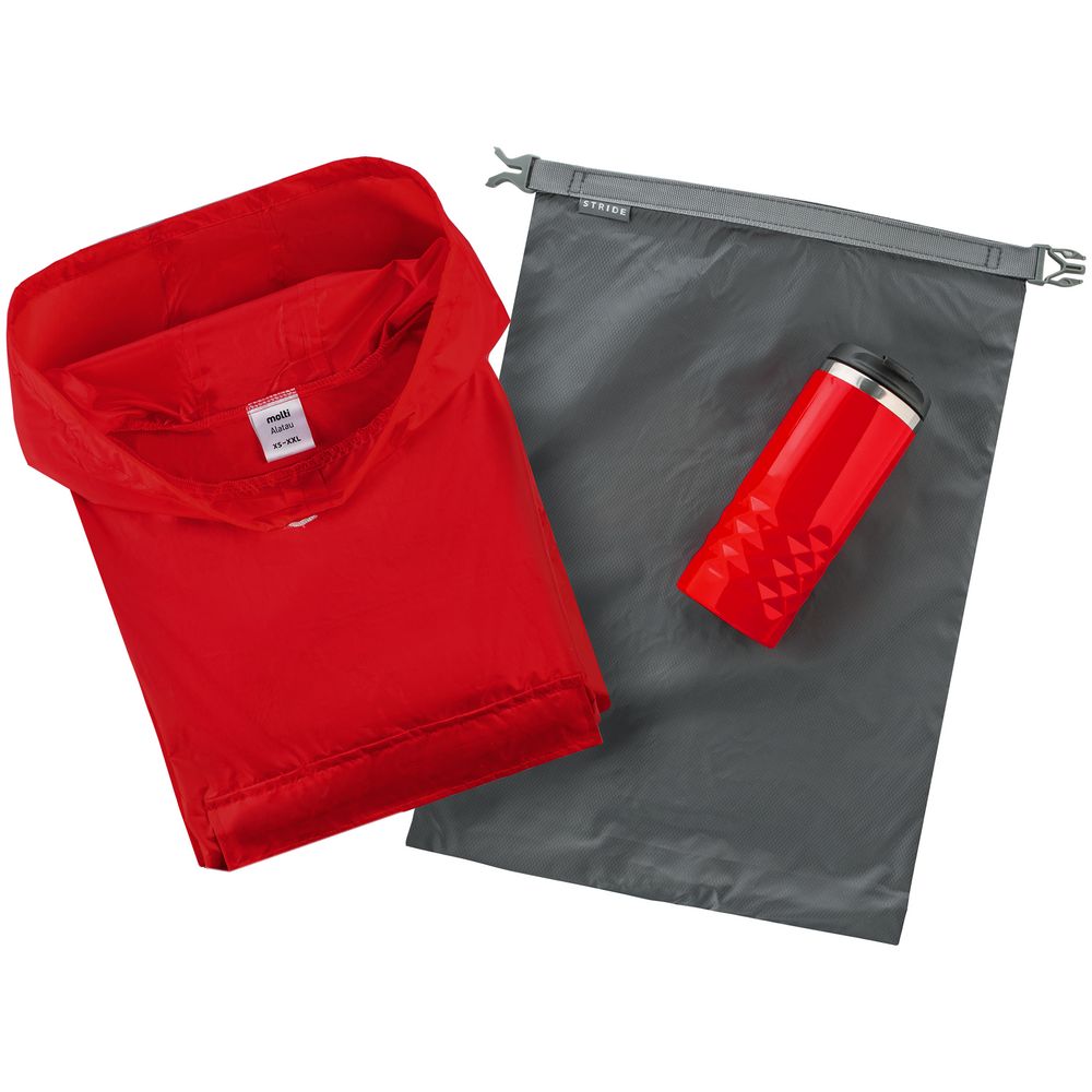 дождевик - полиэстер, мешок - нейлон, рипстоп, нейлон, пластик, полиэстер, термостакан - пластик, нержавеющая сталь