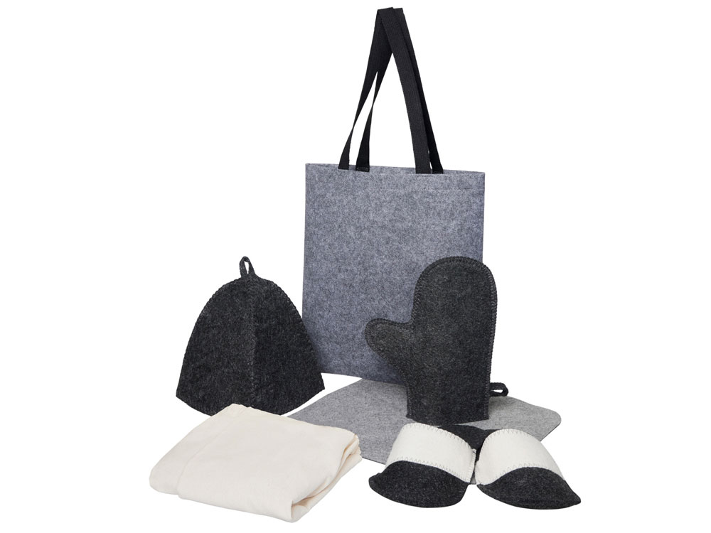 Банный набор Healing для настоящего ценителя сауны: коврик, мужской холщовый килт, рукавица, шапка, двуцветные тапочки — всё в стильном фетровом шоппере.
