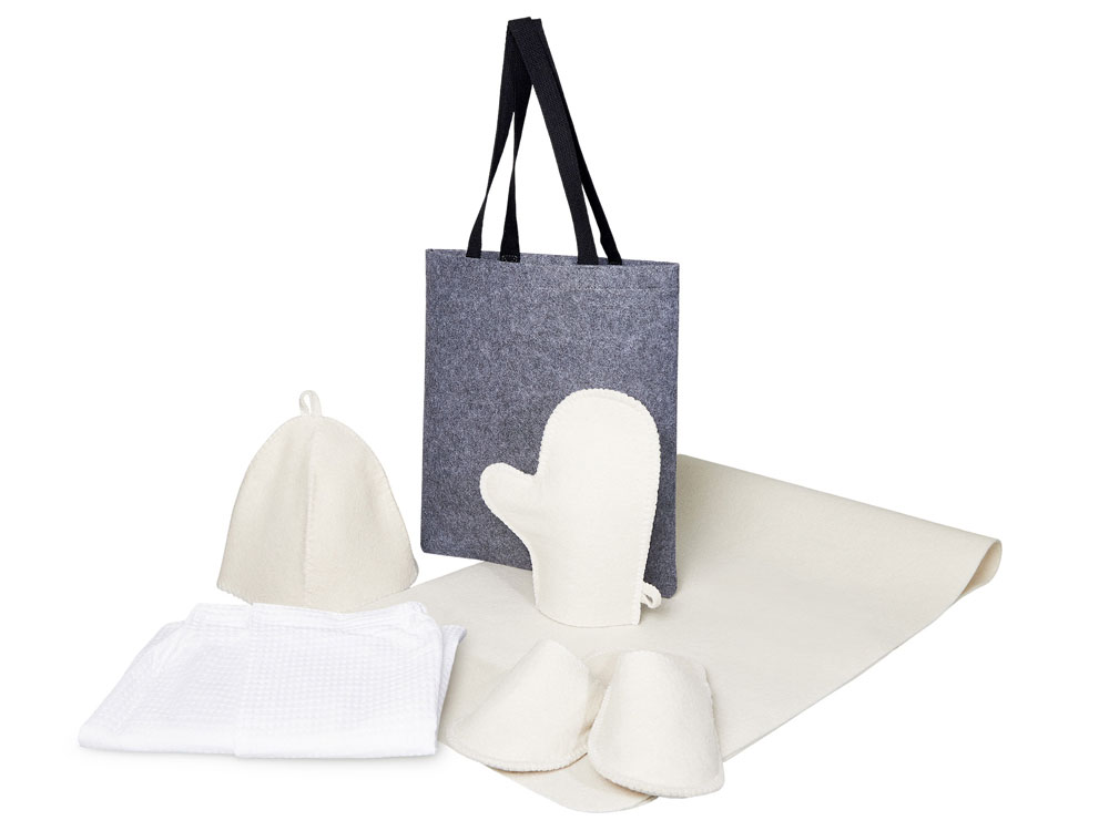 Банный набор Healing для настоящего ценителя сауны: коврик, мужской холщовый килт, рукавица, шапка, двуцветные тапочки — всё в стильном фетровом шоппере.