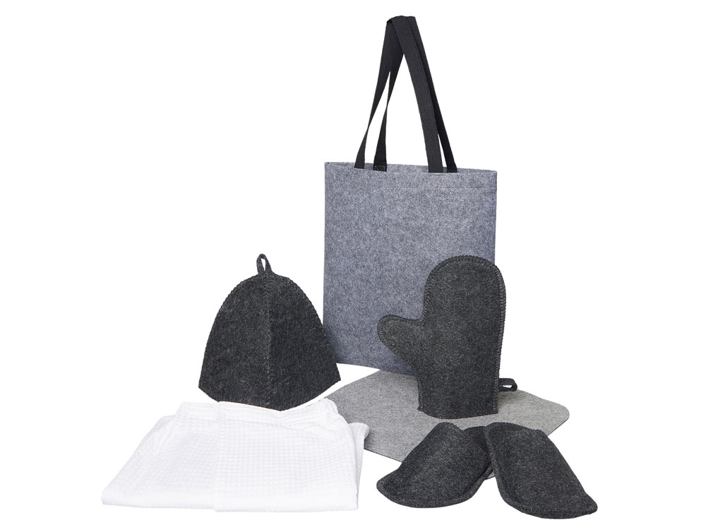 Банный набор Healing для настоящего ценителя сауны: коврик, мужской холщовый килт, рукавица, шапка, двуцветные тапочки — всё в стильном фетровом шоппере.