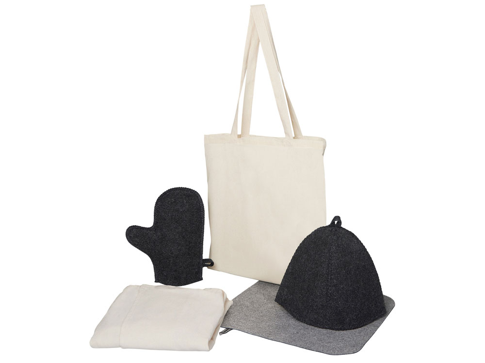 Создайте уют в парной: женский холщовый килт, шапка и рукавица — всё необходимое для отдыха, аккуратно сложено в хлопковый шоппер.