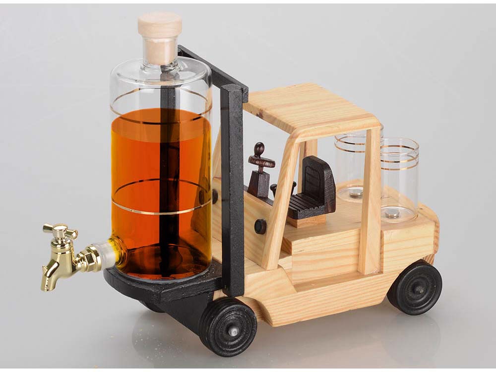 Креативный подарок для руководителей транспортных, производственных и торговых компаний. Графин для виски с краном и подставкой в форме погрузчика оснащен двумя стопками. Набор позволит разрядить обстановку и отметить достижения в узком кругу.