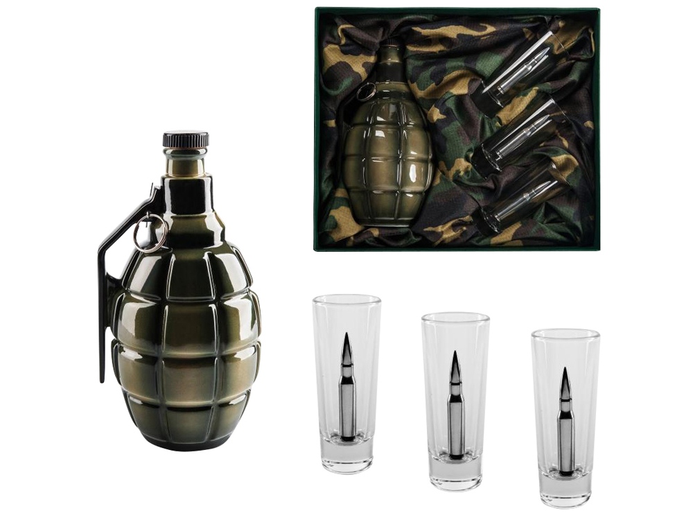 Набор для водки с фарфоровым штофом Бей врага до последнего патрона. Три стопки 50 мл декорированные оловянным барельефом 'Пуля' с керамическим штофом емкостью 0,5 л в виде гранаты.