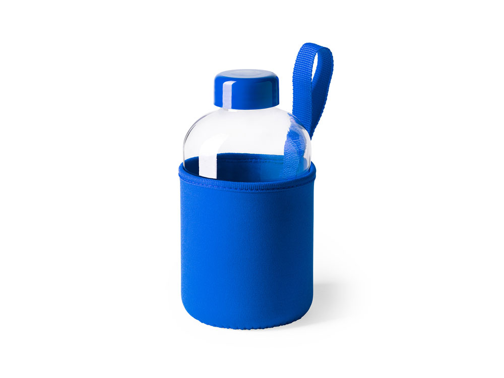 Стеклянная бутылка емкостью 600 мл. включает инновационный неопреновый чехол самых разных цветов с ручкой для переноски.
