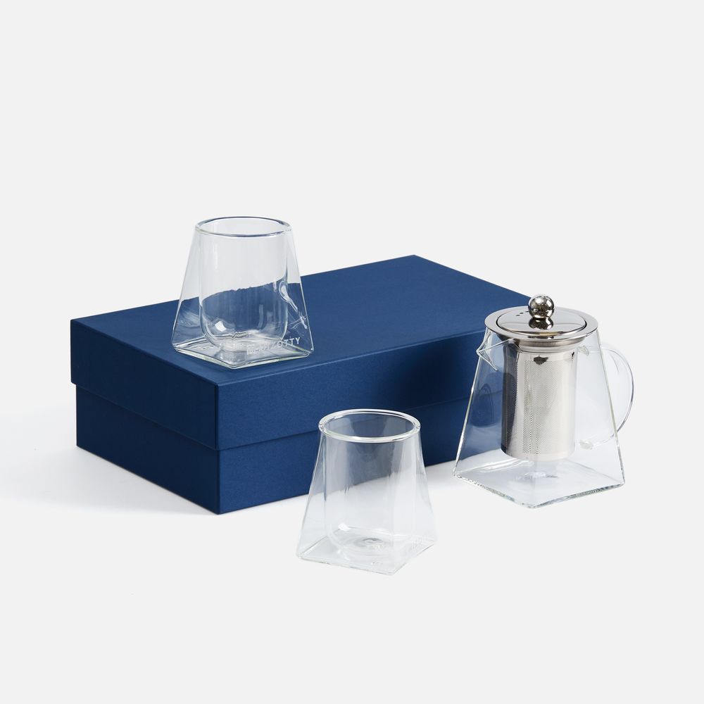 боросиликатное стекло, коробка - переплетный картон, крышка и сито - нержавеющая сталь, нержавеющая сталь, переплетный картон, чайник, стаканы - боросиликатное стекло