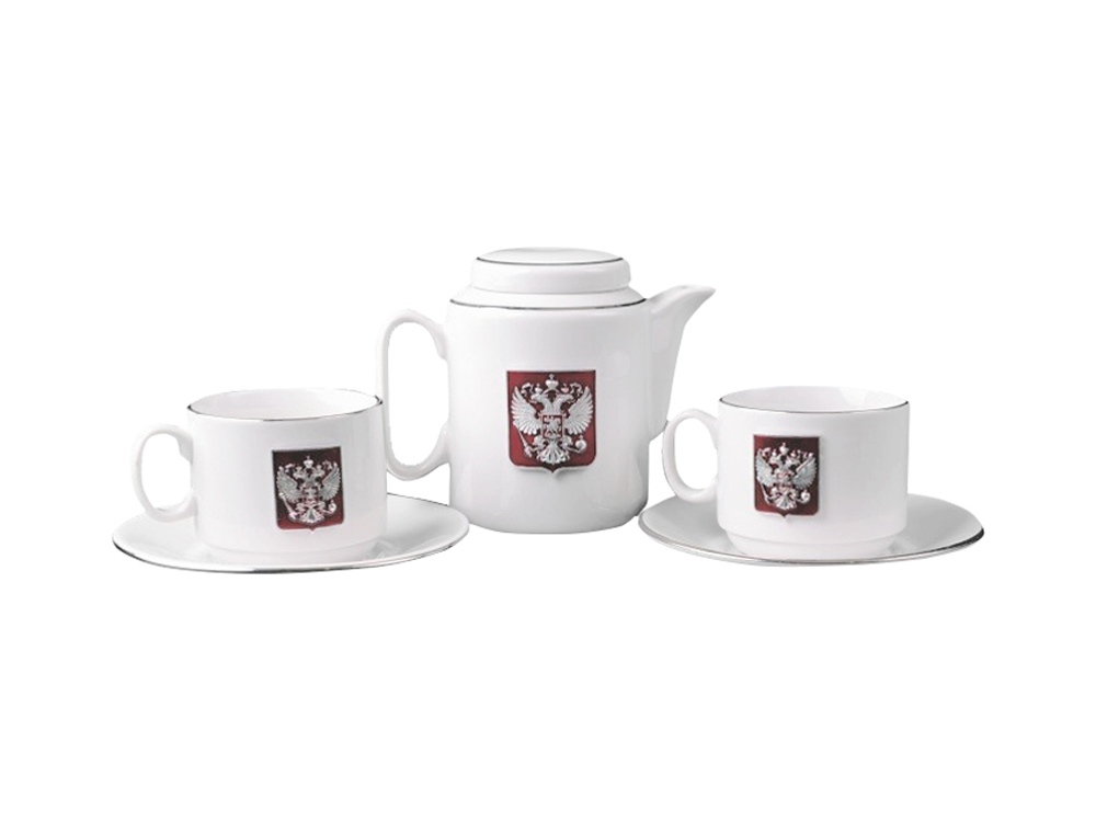 Фарфоровый чайник и две фарфоровые чайные кружки с чеканным металлическим декором Двуглавый орел. Накладка изготовлена из алюминия методом чеканки с декоративной отделкой под золото.