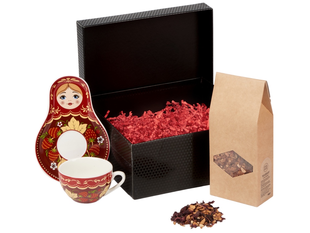 В наборе вы найдете необычную чайно-кофейную пару с подставкой в виде русской Матрешки, которая является одним из главных символов России и чай Глинтвейн фруктовый, 90 г.