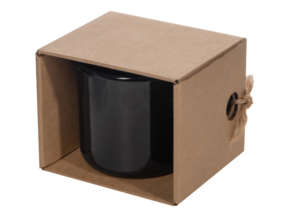 Эмалированная кружка поставляется в необычной упаковке — крафтовой коробке с открытой стенкой. Не беспокойтесь за комплектность — к упаковке кружка присоединена при помощи шпагата, продетого сквозь ручку и отверстия на углу коробки. Необычная подача создает первое впечатление от подарка, заставляя приглядеться к нему внимательнее.