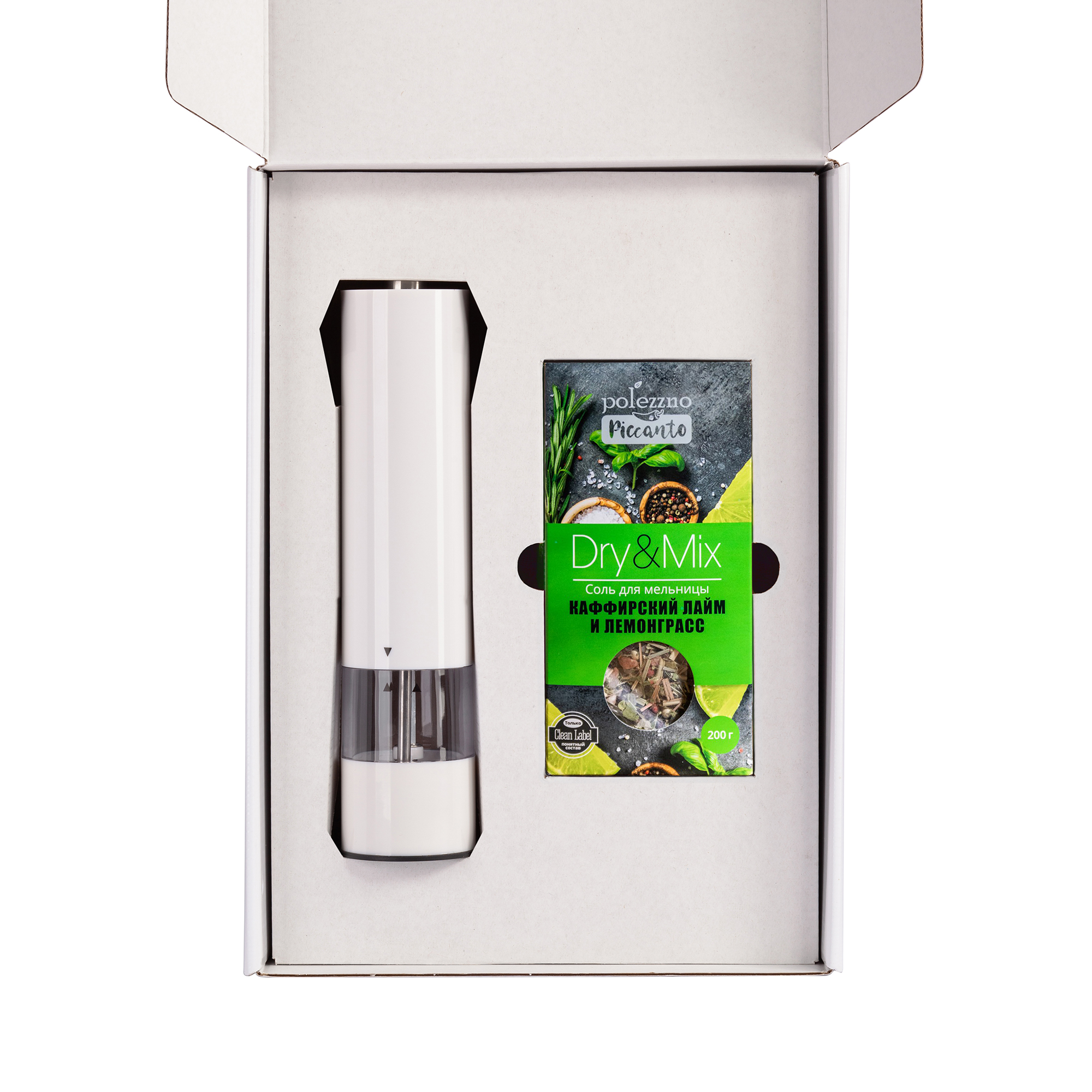 Подарочный набор включает в себя мельницу для специй и готовый набор соли с приправами.