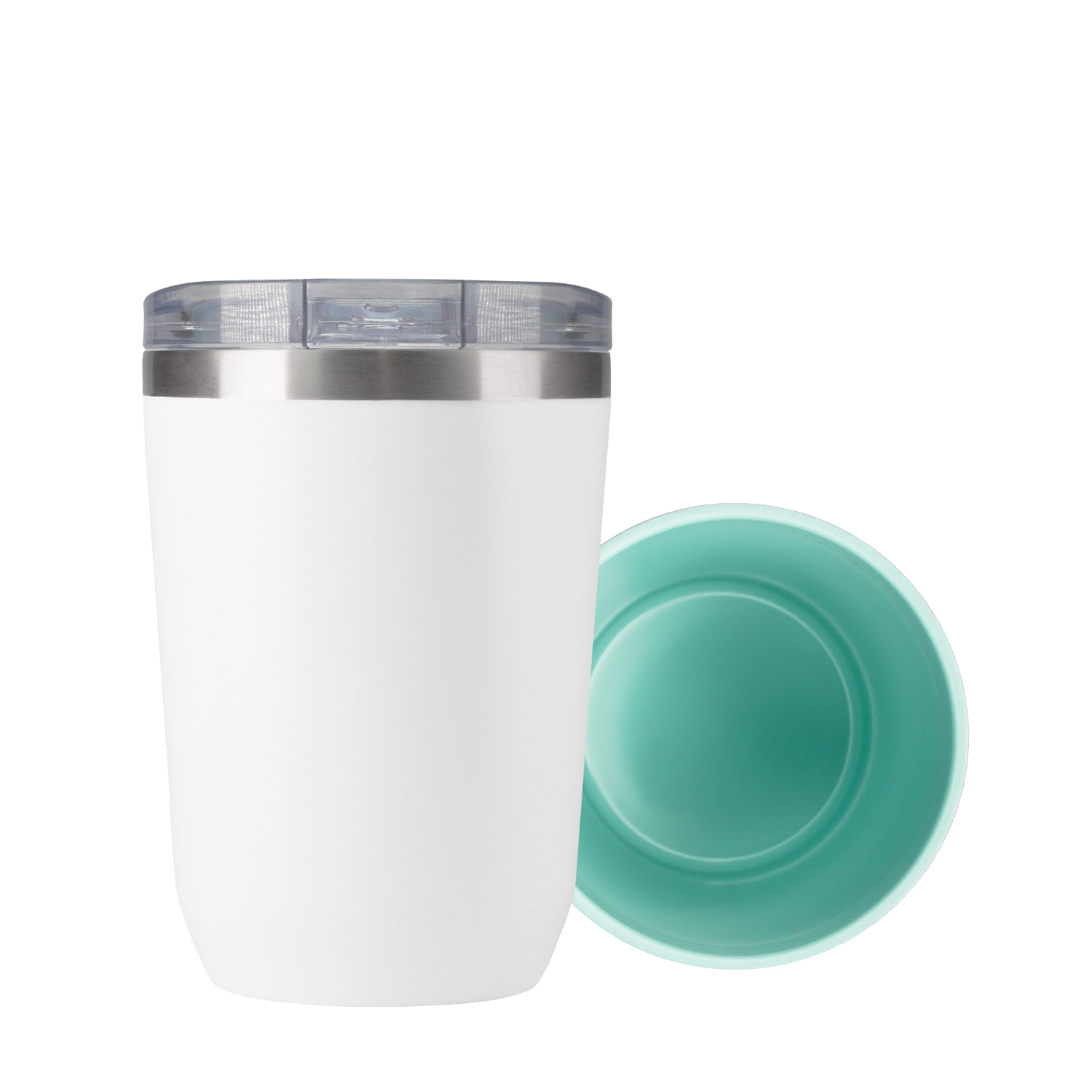Яркий и необычный дизайн – белое порошковое напыление снаружи, и цветная керамическая эмаль внутри. Кружку удобно держать в руке благодаря ее эргономичной форме, напоминающей классический стакан.