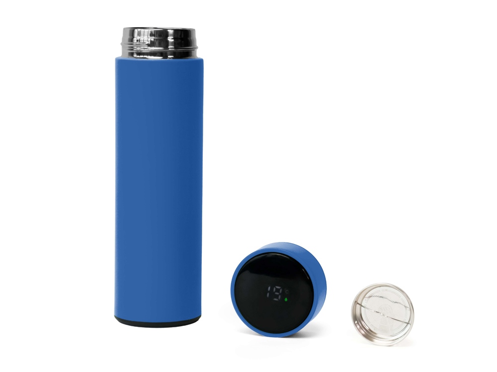 Термос из нержавеющей стали, покрытый цветным soft touch, с крышкой, в которой встроен термометр и LED дисплей, показывающий температуру внутри термоса. Объем: 500 мл. Упаковка: каждый термос в крафт коробке.