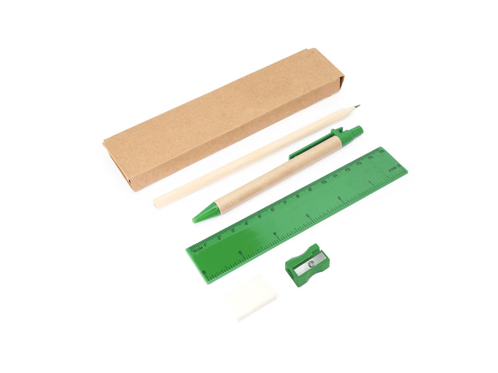Канцелярский набор. Включает ручку с картонным корпусом и синими чернилами, деревянный карандаш, точилку для карандашей, ластик и линейку длиной 15 см.