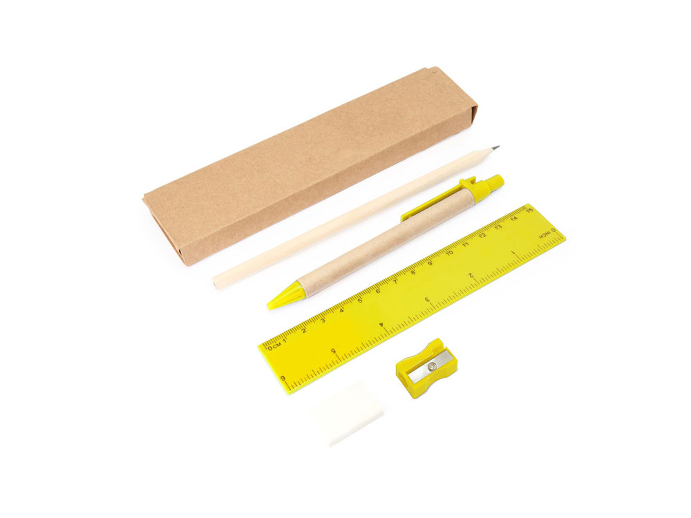 Канцелярский набор. Включает ручку с картонным корпусом и синими чернилами, деревянный карандаш, точилку для карандашей, ластик и линейку длиной 15 см.