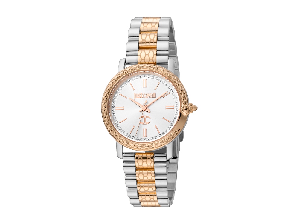 Цвет : корпус- комбинированный (стальной/розовое золото), безель декорирован змеей, циферблат- белый, крепление- стальной/розовое золото