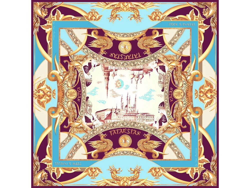 Крылатый барс как — Бог плодородия и покровитель детей, изображение которого присутствует на государственном гербе Республики Татарстан идеально вписывается в общую композицию. На платке барс изображен в виде золотой скульптуры, как и Зилант, это придает платку сказочности, волшебства и царственности.