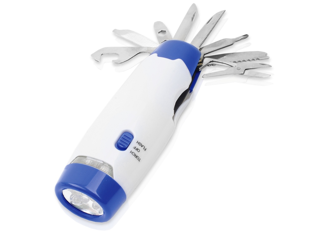 Замечательный фонарик-мультиинструмент дает яркий световой поток синего и красного цветов. Фонарик станет прекрасным и незаменимым помощником во время похода. Тампопечать (1 цвет (белые изделия)) на данный товар осуществляется бесплатно. Оплачивается только настройка оборудования в размере 4000 рублей на весь тираж.