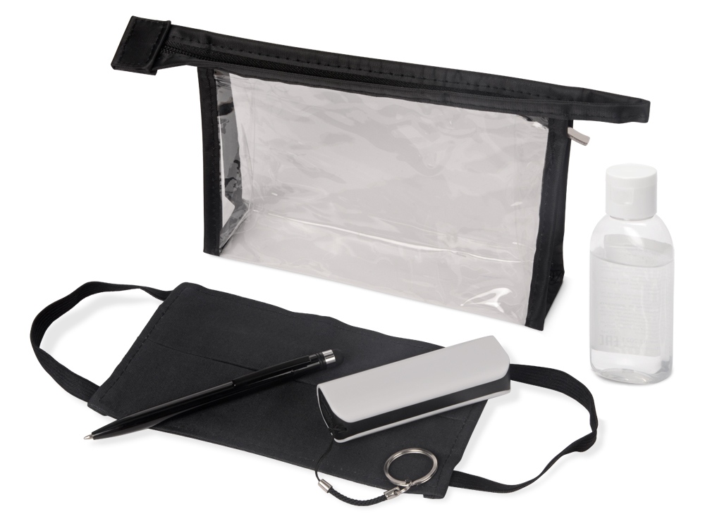косметичка 19 х 12 х 4см, маска 18,5 х 10,5 см, антисептик 50 мл, зарядное устройство 3 х 2,2 х 9 см, ручка-стилус шариковая d0,8 х 12,8 см