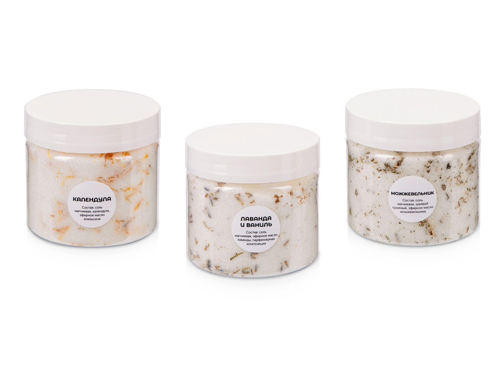 В набор входит три банки соли с ароматами календулы, можжевельника и лаванды с ванилью.