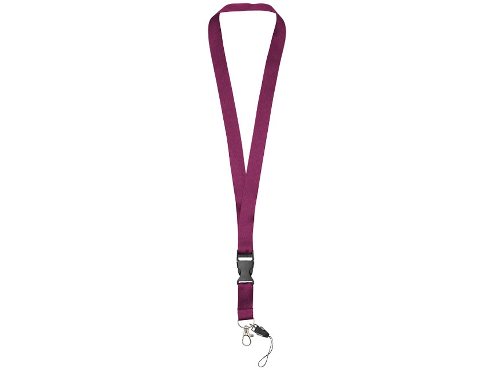 Многофункциональный шнурок с отстегивающейся пряжкой, овальным крючком с зажимом и держателем для телефона. Идеально подходит для бейджа, удостоверения личности или ключей. Предлагается широкий выбор цветов с большим участком для нанесения логотипа. Полиэстер.