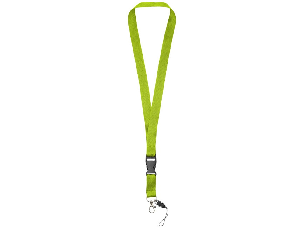 Многофункциональный шнурок с отстегивающейся пряжкой, овальным крючком с зажимом и держателем для телефона. Идеально подходит для бейджа, удостоверения личности или ключей. Предлагается широкий выбор цветов с большим участком для нанесения логотипа. Полиэстер.