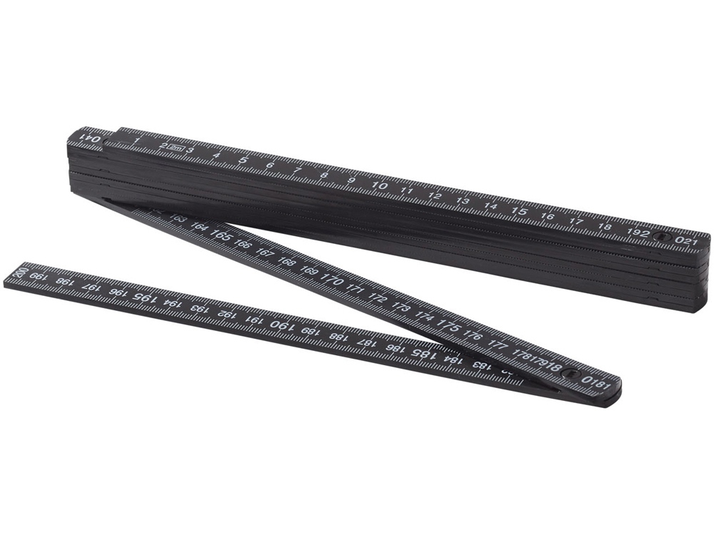 Складная линейка длиной 2 м. Двусторонняя линейка со шкалой на 200 см с одной стороны и 79 дюймов с другой. Линейка состоит из нескольких складных частей. АБС-пластик. На боковую часть можно нанести логотип компании.
