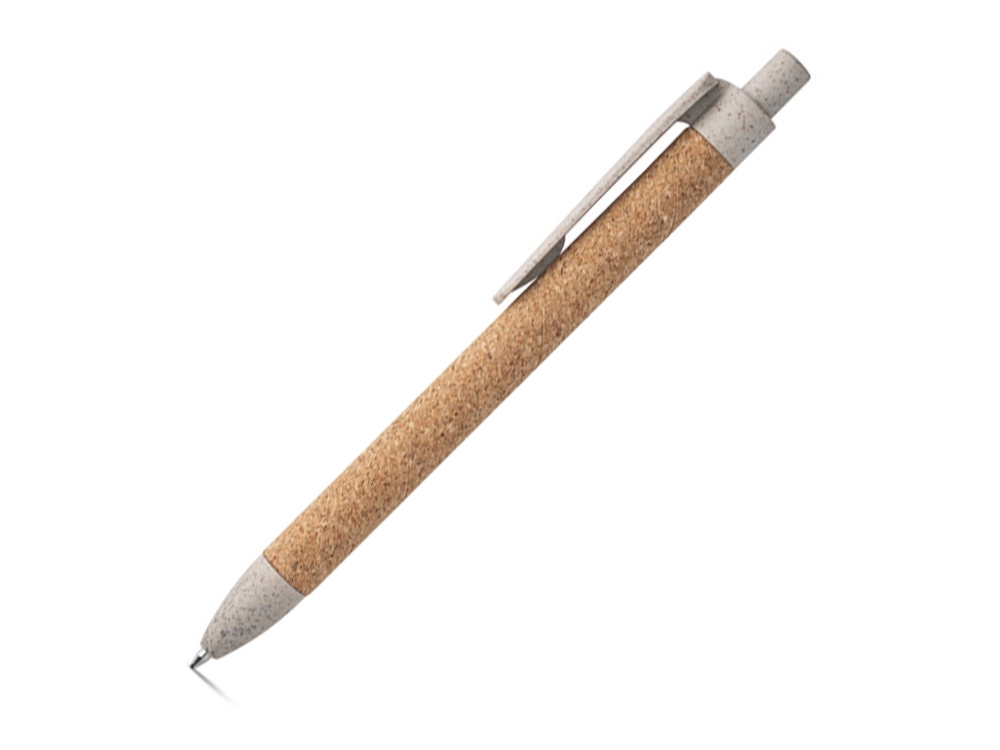 Шариковая ручка из пробки с зажимом, резиновым грипом и цветными элементами из пшеничного волокна и полипропилена. Пишет синим цветом. ø11 x 140 мм.
