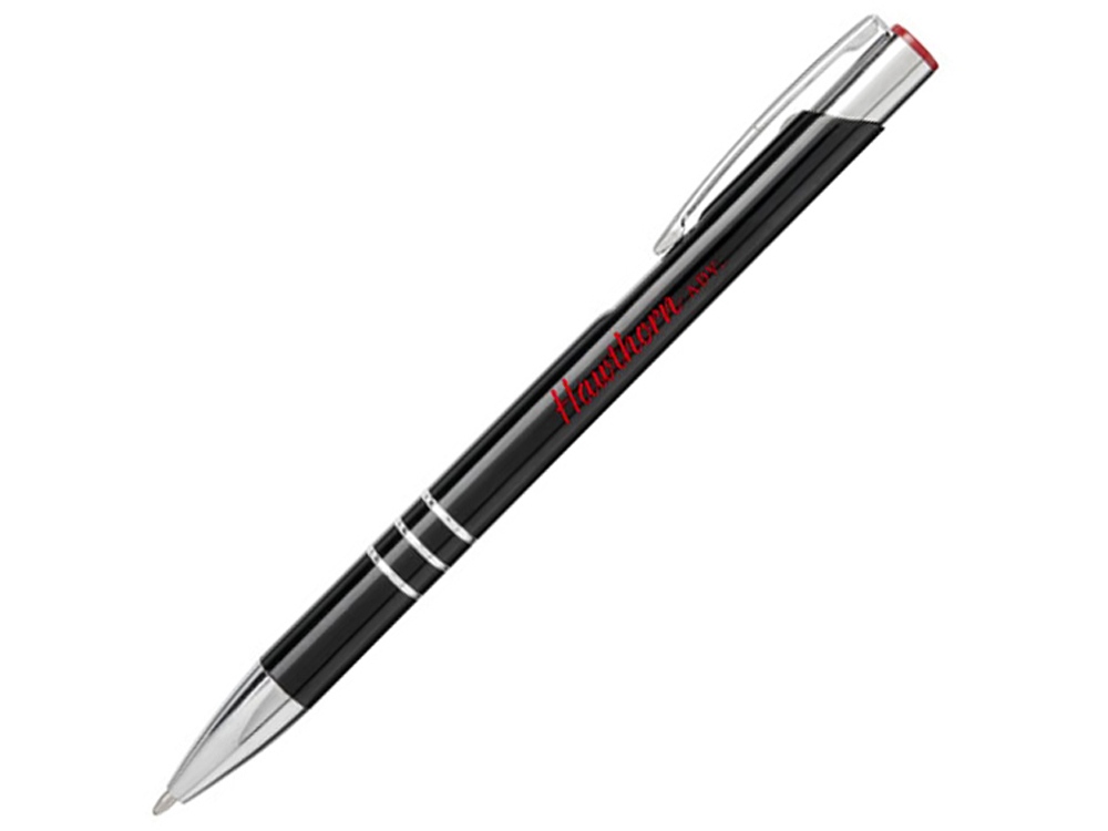 Черная шариковая ручка с кнопочным механизмом. Цвет кнопки совпадает с цветом гравировки.