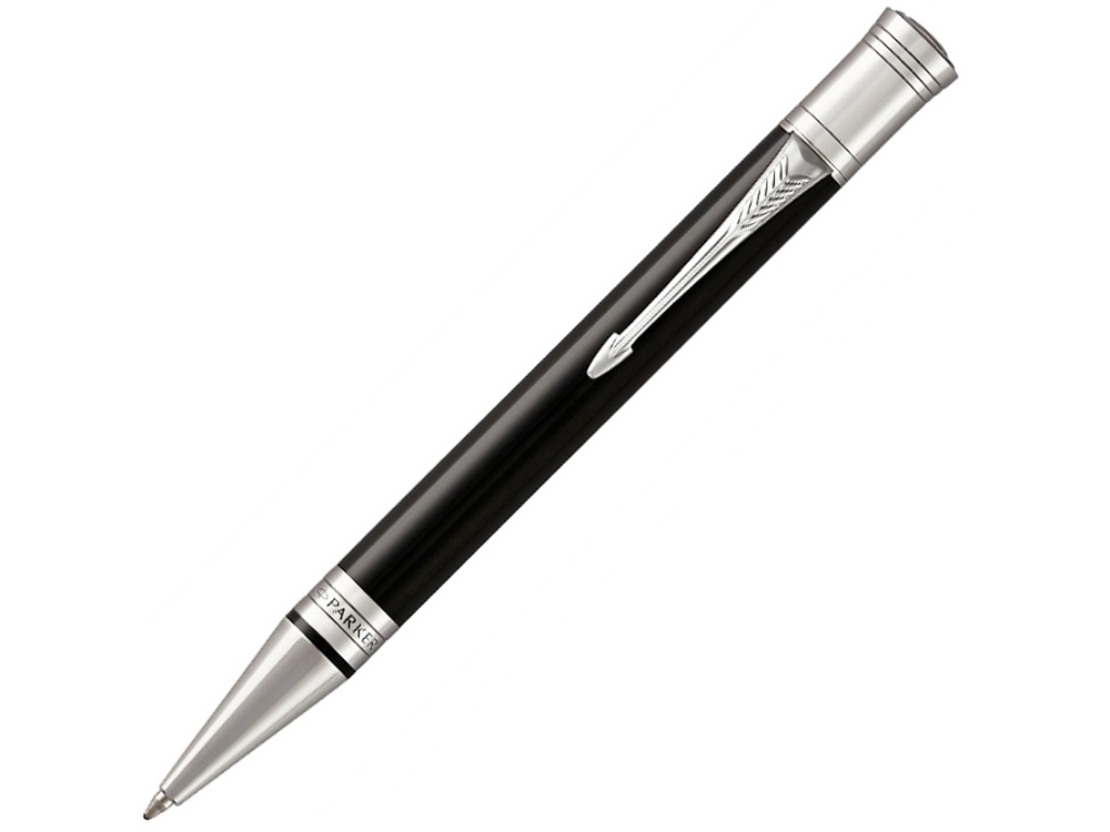 Шариковая ручка Duofold K74 с поворотным механизмом. Клип выполнен в виде стрелы, сделан из бериллиевой меди покрытой никеле-полладием. Эмблема на торце ручки из латуни с гравировкой со знаком туза. На корпусе из акриловой смолы черного цвета гравировка с исторической лентой Parker. Кольцо корпуса и зона захвата из латуни с никеле-полладиевым покрытием. Фирменная упаковка Parker, на боковой стороне коробки нарисованы гербы - подтверждение гарантии Британского Королевского двора. Сделано во Франции.