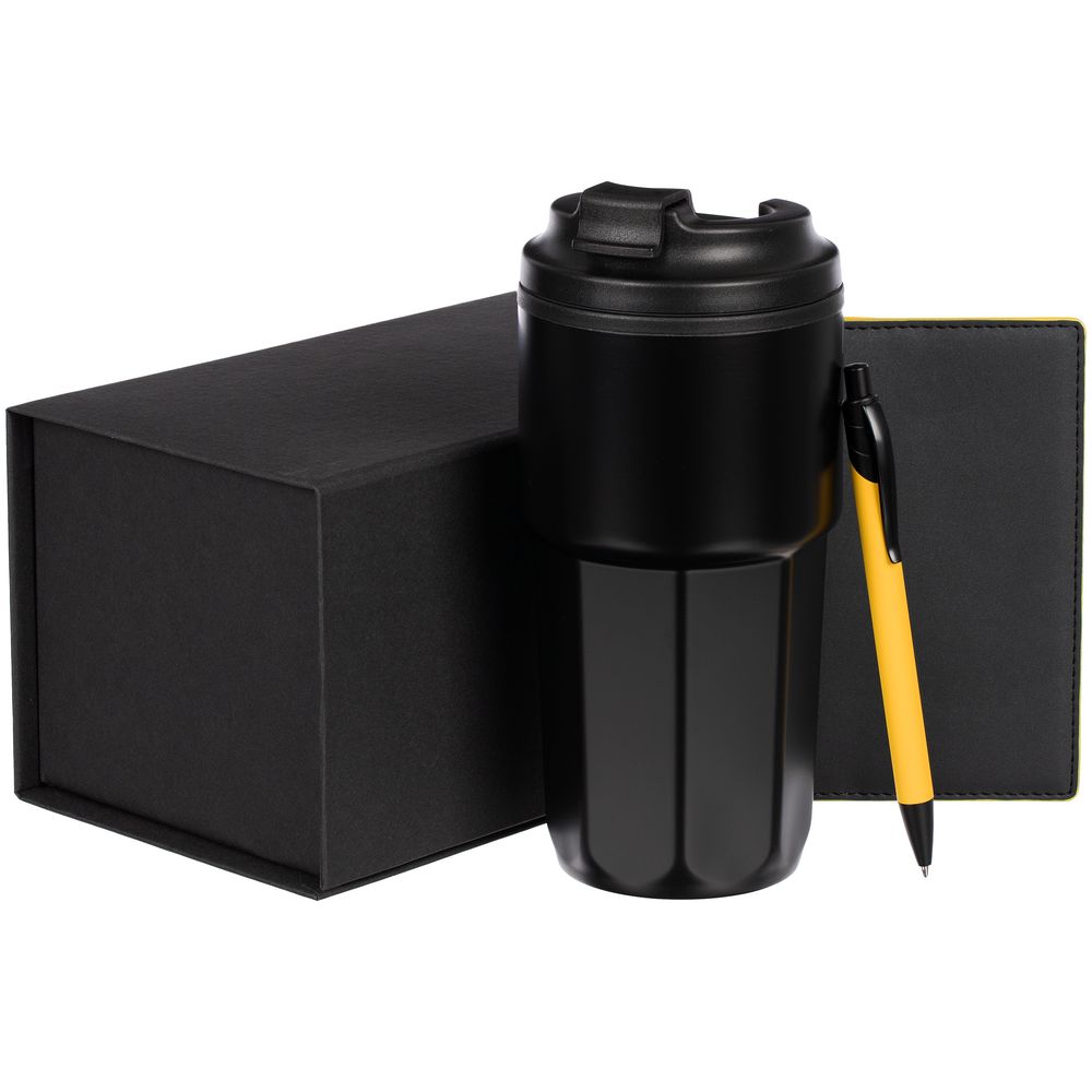 искусственная кожа, коробка - переплетный картон, металл, нержавеющая сталь, обложка для паспорта - искусственная кожа, переплетный картон, ручка - металл, пластик, термостакан - нержавеющая сталь, полипропилен
