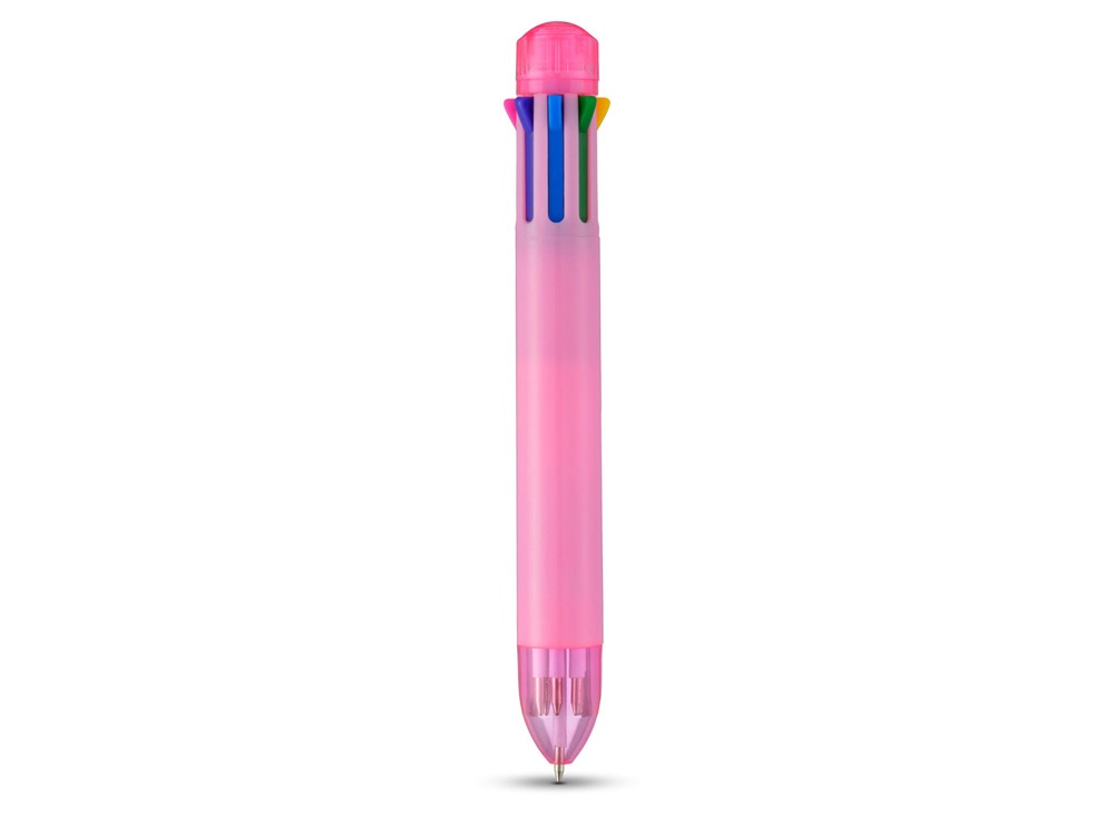 Многостержневая шариковая ручка с кнопочным механизмом и стержнями 8 различных цветов: черным, синим, зеленым, оранжевым, розовым, фиолетовым, красным и желтым.