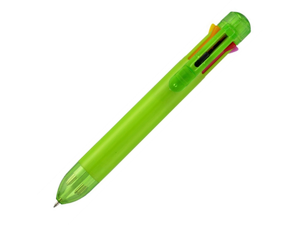 Многостержневая шариковая ручка с кнопочным механизмом и стержнями 8 различных цветов: черным, синим, зеленым, оранжевым, розовым, фиолетовым, красным и желтым.