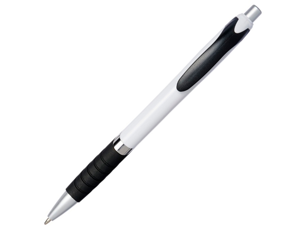 Шариковая ручка Turbo в белом корпусе. Популярная, стильная кнопочная шариковая ручка в белом корпусе с цветным зажимом, резиновой накладкой и дополнительной серебристой отделкой. АБС пластик.