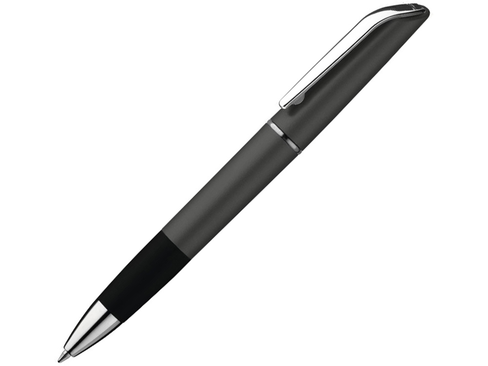 Шариковая ручка с поворотным механизмом и прорезиненной зоной захвата в черном цвете. Металлический клип, декоративное кольцо и металлический наконечник выполнены в серебристом глянцевом цвете. Матовый корпус.