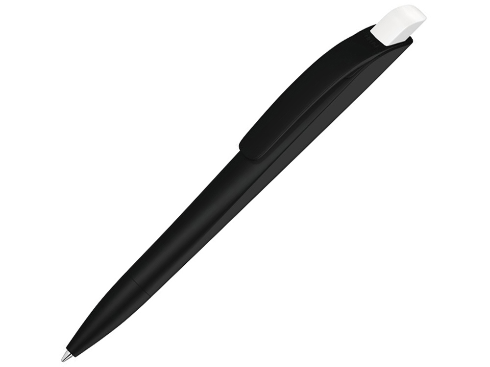 Автоматическая шариковая ручка с нажимным механизмом, матовым тонированным белым корпусом и цветным наконечником, широким изогнутым клипом.